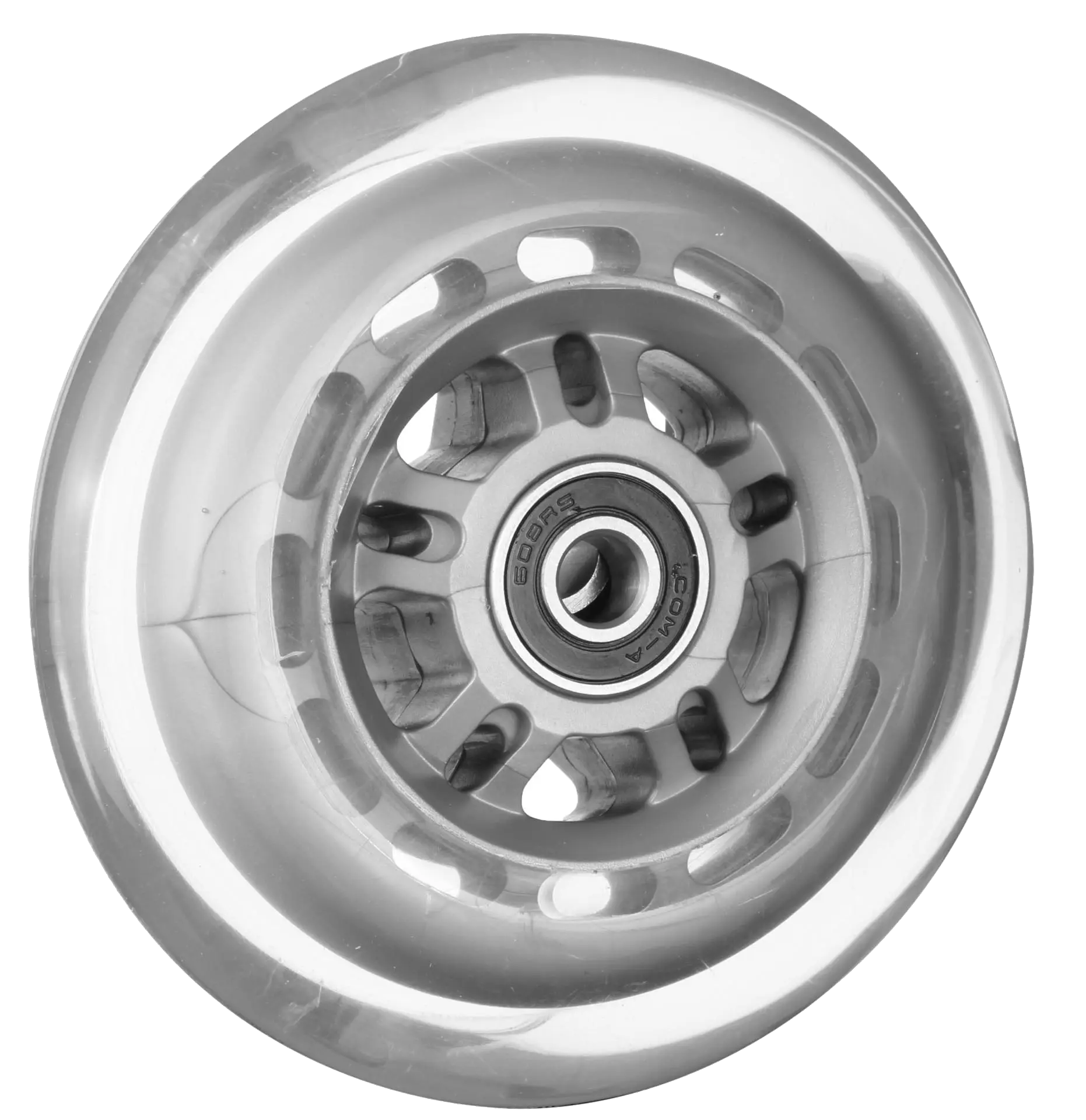This 4×1″ rollerblade caster wheel has a transparent polyurethane tire on a silver composite hub. Suited for indoor use rollerblade wheels can offer a very smooth ride compared to standard caster wheels.
