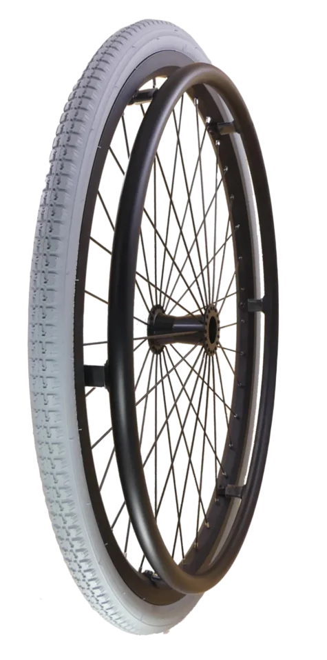 The Perigon wheel is a black aluminum double wall rim with 36 black spokes comparable to Shadow wheels by TiLite. This assembly(sold individually) includes the rim, tire(gray street tread) with solid insert, and a black anodized aluminum handrim all as a complete installation. The axle is not included.