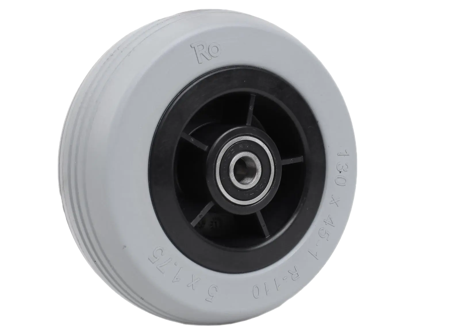 A replacement 5″ x 1.75″ caster wheel with a gray tire on a black hub. Compatible with various Jazzy and Quantum power wheelchairs by Pride Mobility.